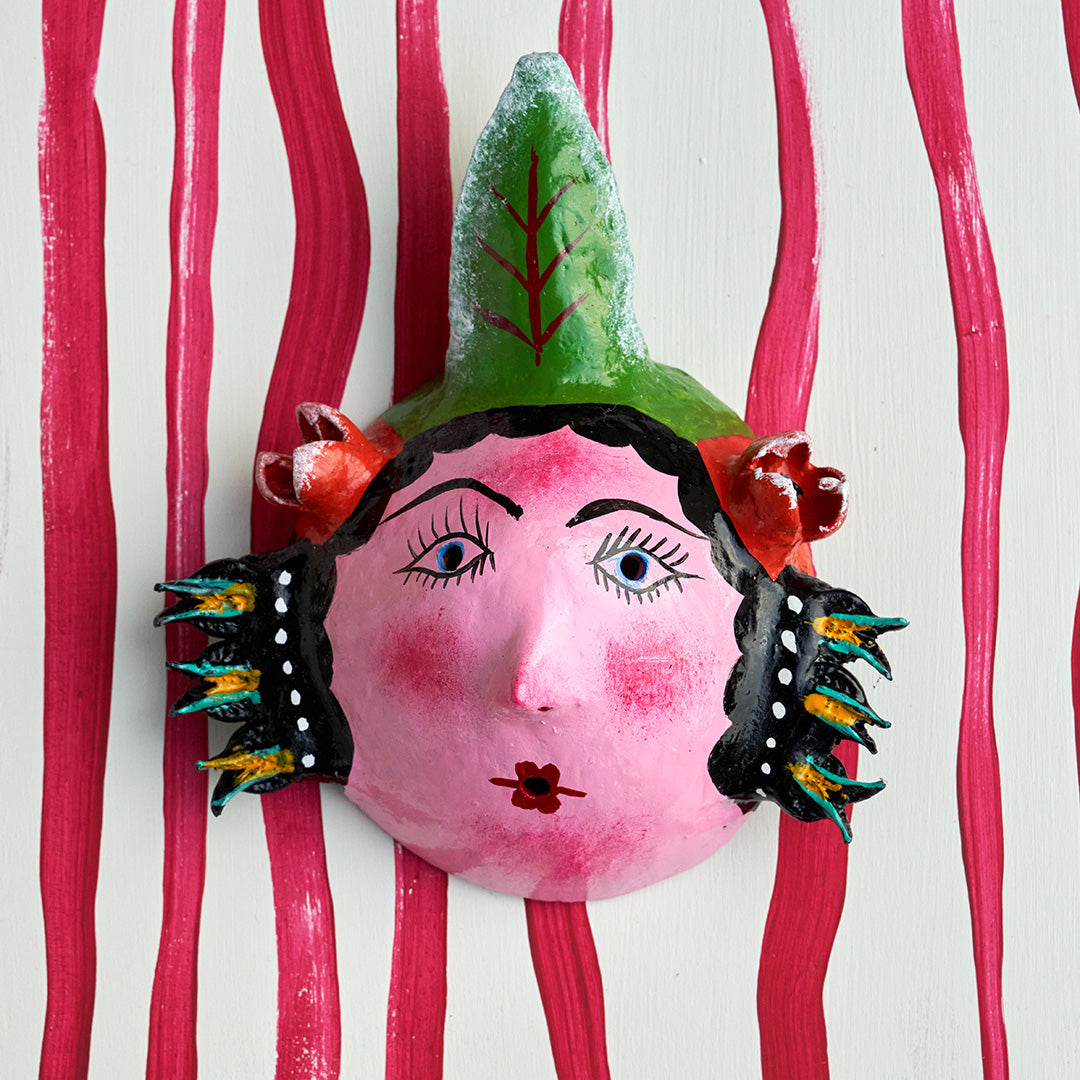 Handmade in Mexico City, and the epitome of some of the best Folk Art out there, these Coconut heads are handmade using coconuts, papier mache, straw, paint and varnish. They look fantastic when hung on a wall.