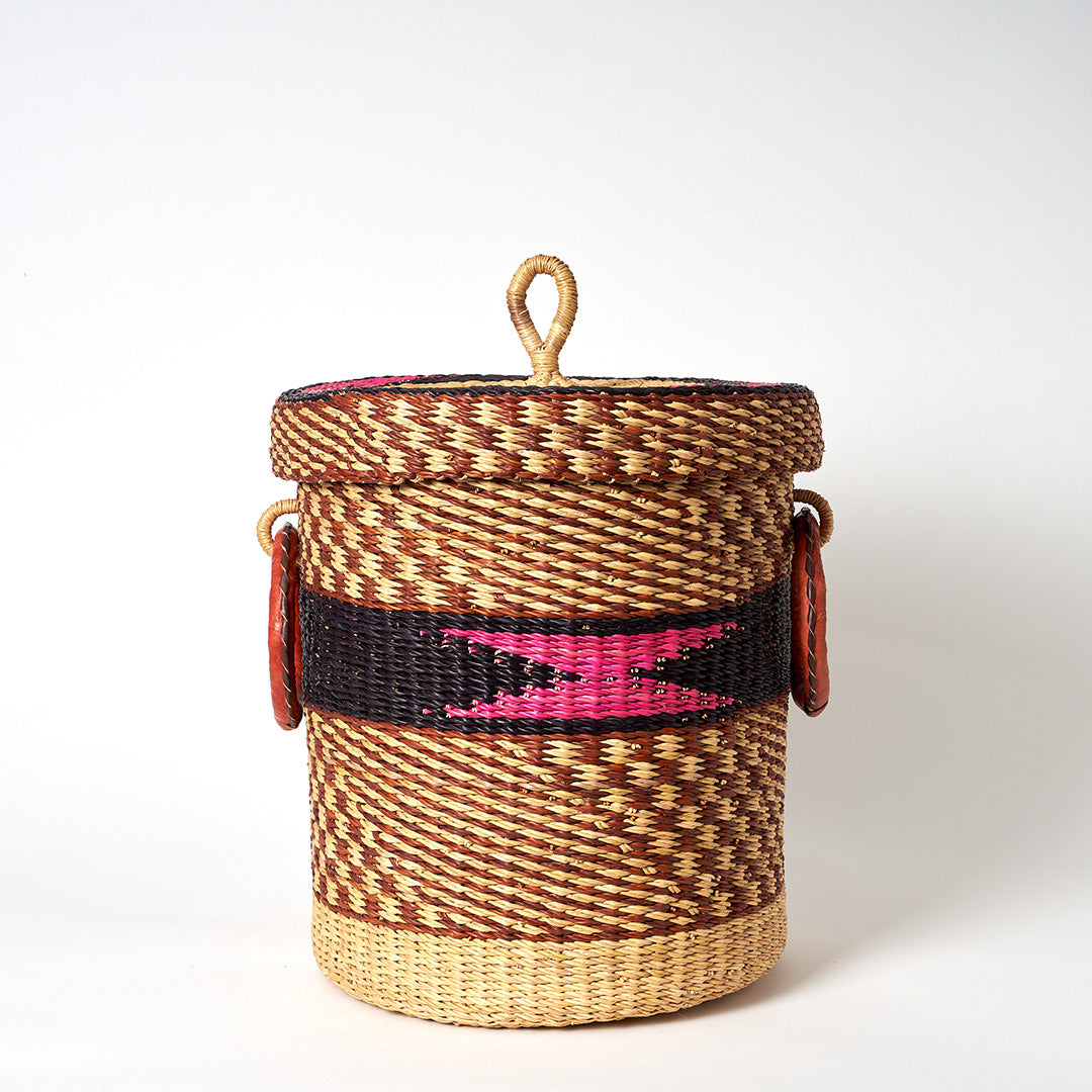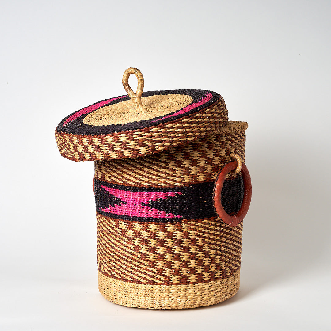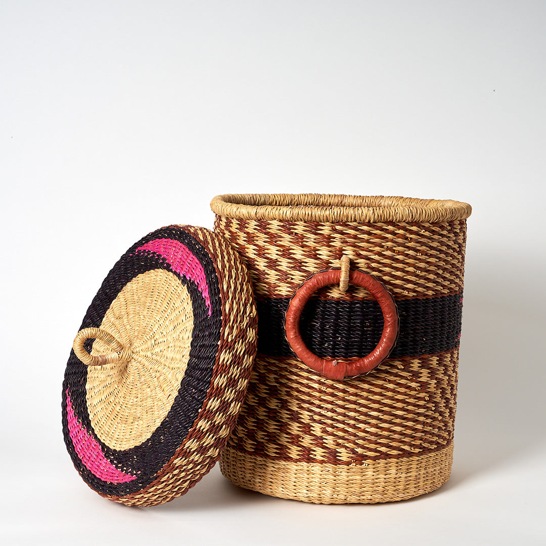 Small Storage Basket with leather bound handles and Lid- Navy, Pink & Cinnamon